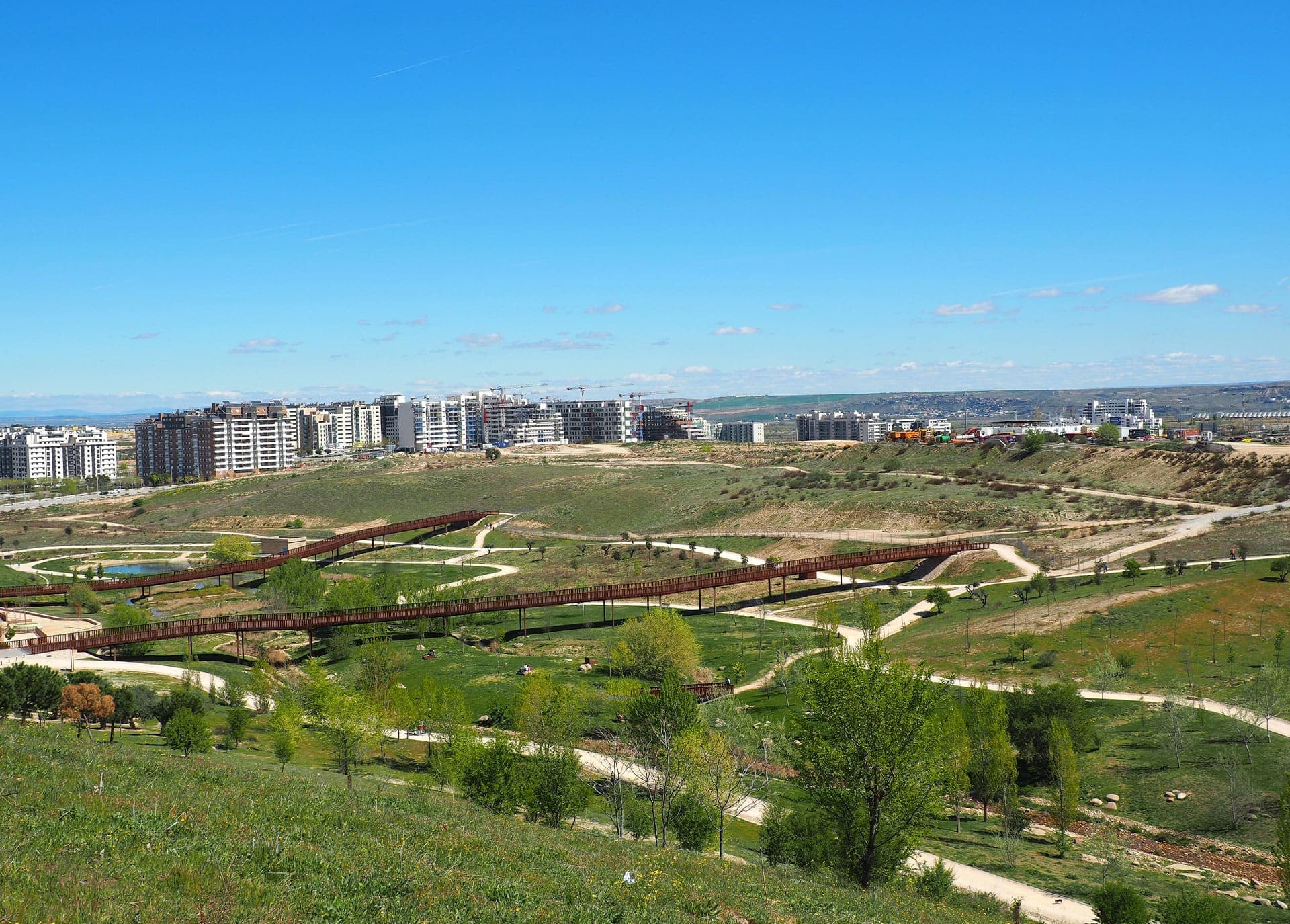 Sobre todo, la gente ama Valdebebas por su espacio abierto: la mitad de la superficie del vecindario la conforma un parque de 340 hectáreas, tan grande como Central Park y Hyde Park juntos, lleno de caminos para pasear, carriles bici y parques infantiles. Más de 300.000 árboles forman un oasis verde que atrae a quienes aman la naturaleza, ir en bici, correr o salir a pasear con su perro.